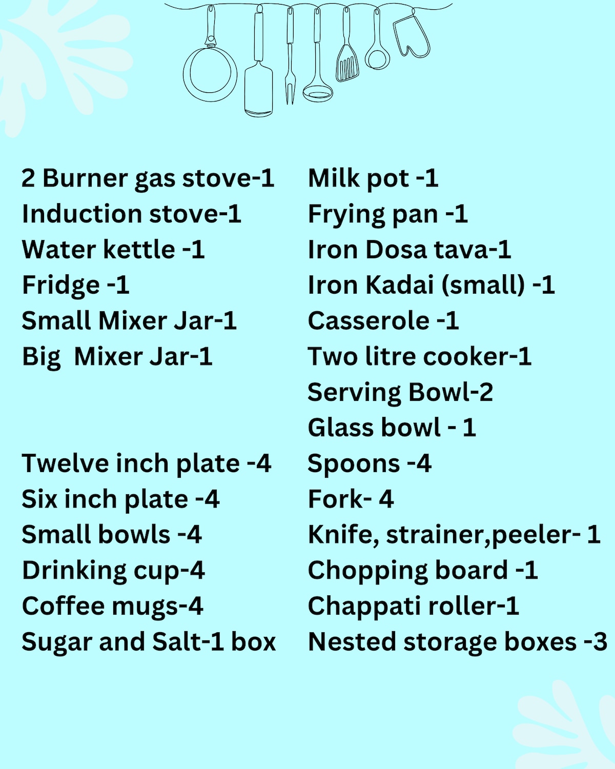 🌟Complete kitchen comes with gas stove ,full size sink,fridge and all essential utensils.